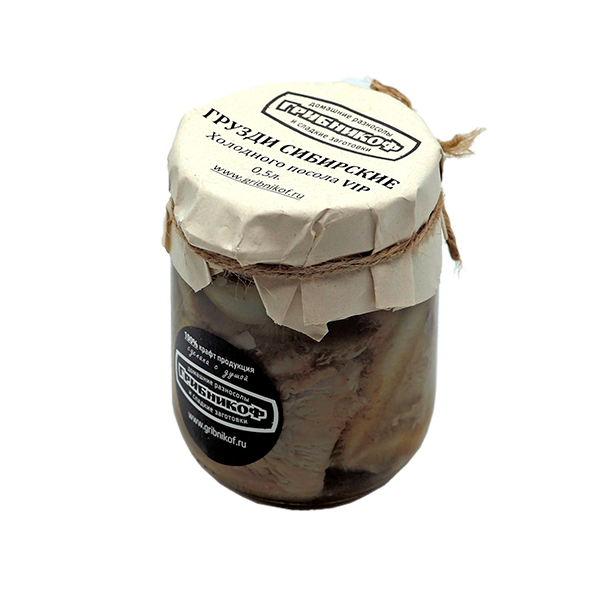 Солёные грузди сибирские, рассол (вода, специи, соль), хрен, чеснок.