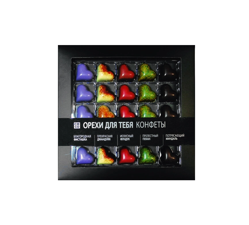 подарочная коробка кофет в виде сердечек, покрытых разноцветной глазурью. В качестве начинки выступают сицилийский миндаль, орех пекан, пьемонтский, лесной орех (фундук) и фисташка. Каждому цвету соответствует свой орех, на который указывают оригинальные надписи на верхней части коробки. Конфеты отлично подойдут к бокалу хорошего красного вина, а также к кофе или чаю.