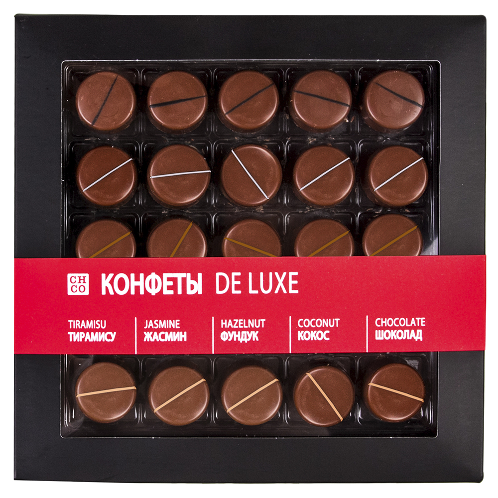 Премиальный набор шоколадных конфет - 25 изысканных конфет с начинкой в пяти утончённых вкусах: тирамису, жасмин, фундук, кокос и классический шоколад. Идеальный выбор для подарка и особых моментов наслаждения.
